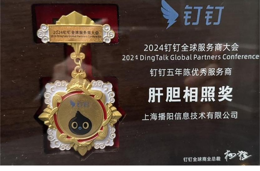 在2024年1月召開的釘釘全球服務商表彰大會,上海播陽獲得釘釘頒發的《釘釘優秀服務商“肝膽相照”獎》,以表彰播陽公司在過去五年在釘釘業務的創新和貢獻