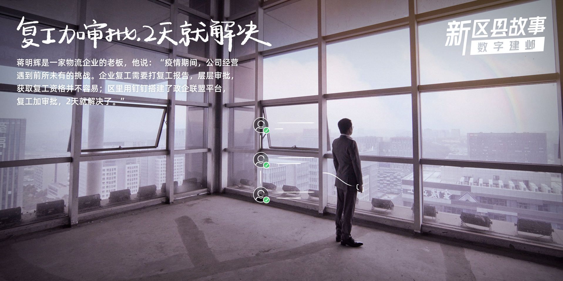 蔣明輝是一家物流企業的老板,他說:“疫情期間,公司經營遇到前所未有的挑戰。企業復工需要打復工報告,層層審批,獲取復工資格并不容易;區里用釘釘搭建了政企聯盟平臺,復工加審批,2天就解決了。”