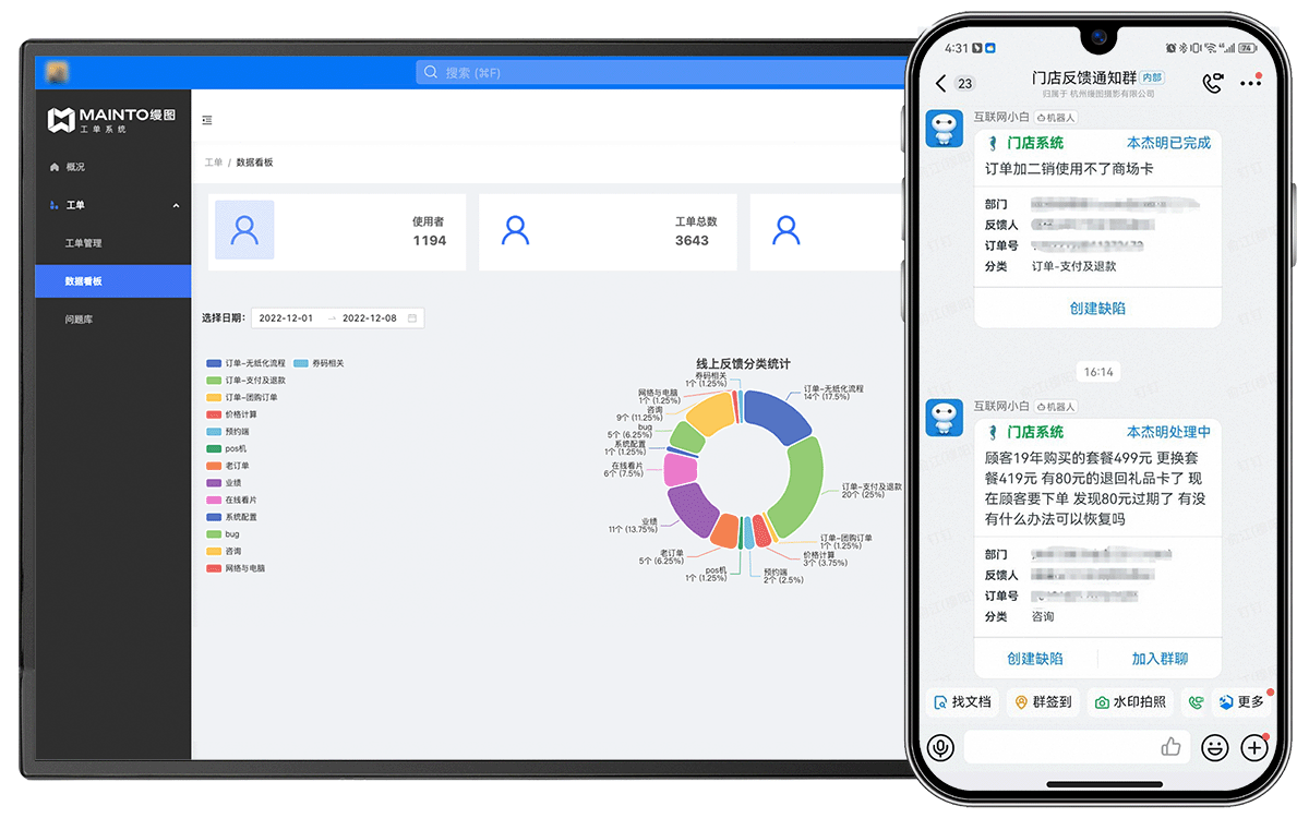日常問題處理、門店咨詢等事項通過工單系統(tǒng)進行一鍵自動指派和工單群創(chuàng)建,快速流轉(zhuǎn)到對應(yīng)負(fù)責(zé)人進行問題響應(yīng)。在群聊中即可實現(xiàn)問題逐一閉環(huán),有力提升門店問題處理效率與門店客戶服務(wù)體驗。